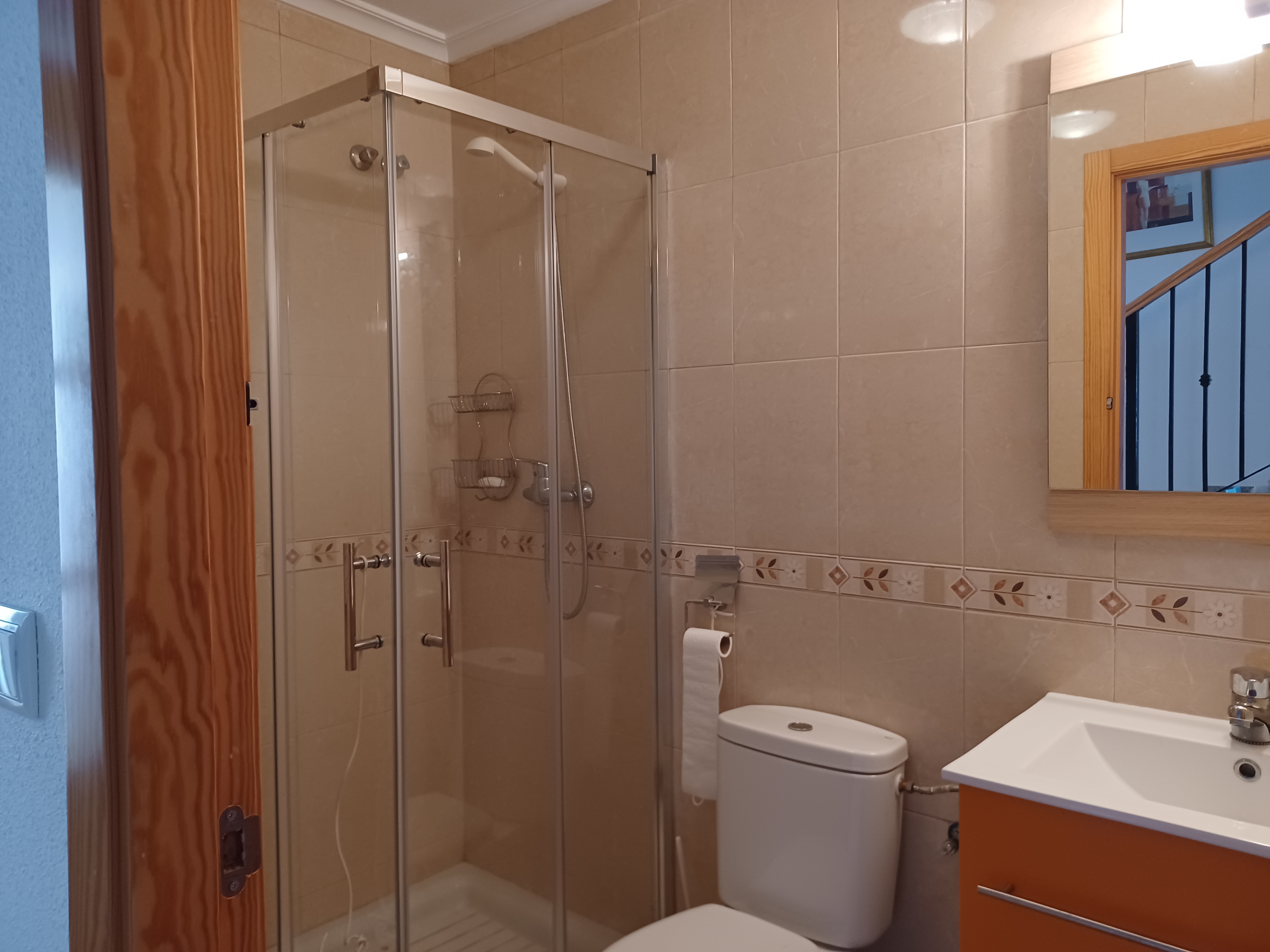 2 Schlafzimmer im ersten Stock sowie 1 Badezimmer mit Badewanne. 1 Badezimmer mit Dusche im Erdgeschoss